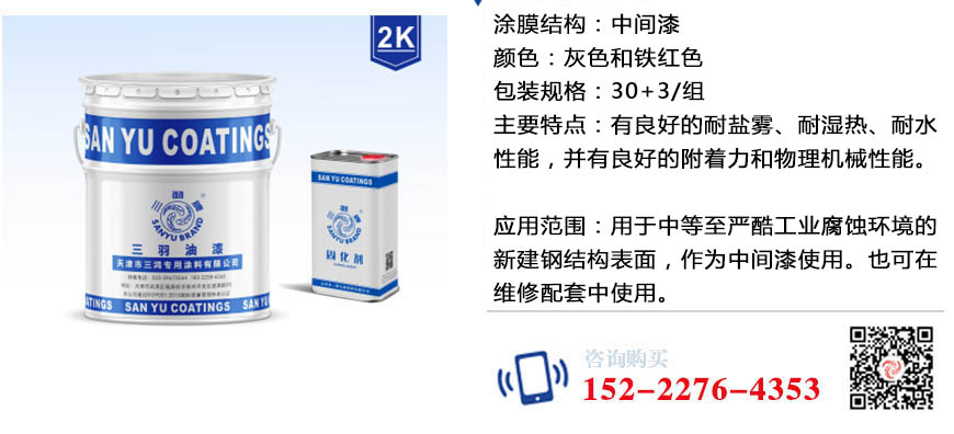 用于中等至严酷工业腐蚀环境的新建钢结构表面,作为中间漆使用。也可在维修配套中使用。有良好的耐盐雾、耐湿热、耐水性能,并有良好的附着力和物理机械性能,适用于钢铁表面防潮防锈防腐用。