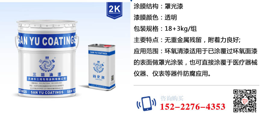 环氧清漆在已涂覆过环氧面漆的表面做罩光涂装,可提升复合涂层防腐性能与装饰性。也可直接涂覆于医疗器械、室内木材、仪器、仪表等器件防腐应用。