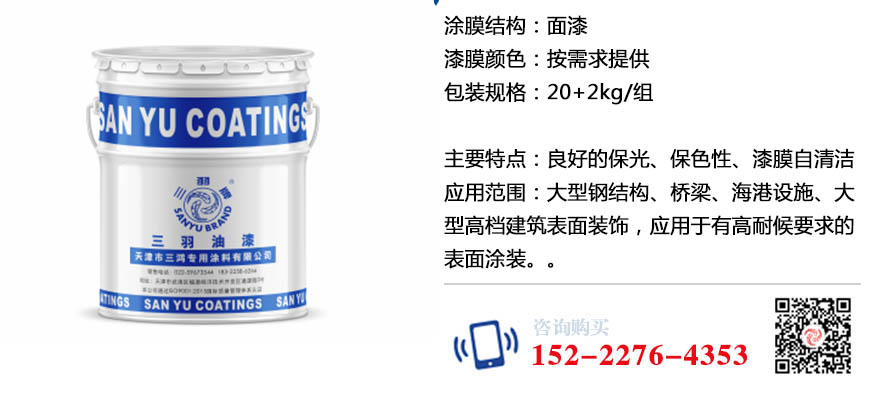 氟碳面漆适用于严酷工业腐蚀环境的钢结构表面,包括海上钢结构、风力发电塔架、大型钢结构、桥梁、大型高档建筑表面装饰,应用于有高耐候要求的表面涂装。