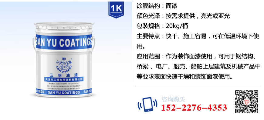 可用于钢结构、桥梁、护栏、电厂、船壳、船舶上层建筑及机械产品等要求表面快速干燥和装饰面漆使用。